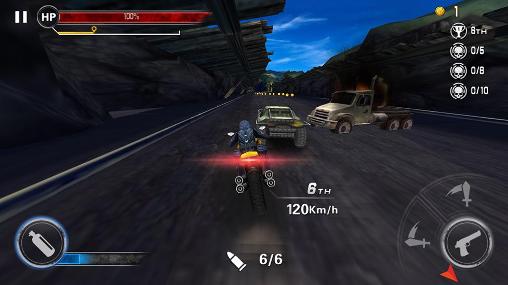 Drive along the track on the motorcycle at the top speed overcoming a lot of obstacles and destroying enemies. Drive a powerful motorcycle along the roads of this deadly game for Android. Dodge the oncoming traffic and avoid accidents. Use a variety of cool guns to destroy enemies on the road. Do missions, collect gold coins, buy more powerful motorcycles and better weapons. Upgrade your motorcycles improving their performance.