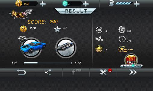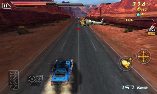 Drive a fantastic race car with powerful weapons. Overtake opponents and destroy them with good shots. Take part in a deadly races on tracks of this game for Android. Run along a highway at insane speed. Tack from side to side to avoid collisions with cars on the road. Open fire from rocket launchers and other weapons. Explode cars of your opponents, enemy helicopters, and other equipment. Upgrade your car, buy new cars and weapons.