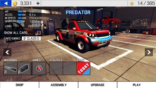 Take part in deadly survival races. Drive your car on interesting tracks. Overtake your opponents and win at any cost. Become the best racer and try to survive in this hard-edged competition of this Android game. Accelerate your car to the maximum speed stepping on the gas as hard as you can. Overtake rivals and push them off the track. Destroy opponents using various weapons that can be mounted onto any car. You have machine guns, rocket launchers, mines, bombs, etc.