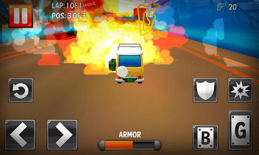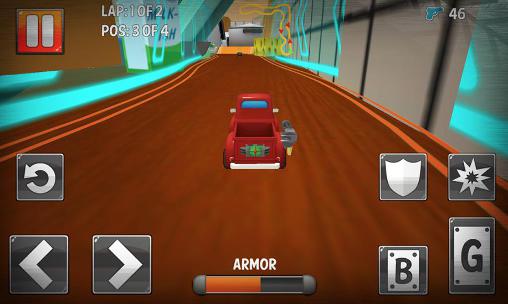 Drive a toy vehicle along tracks in different parts of the house. Overtake your opponents and explode them using weapons. Take part in a dynamic races on toy cars in this game for Android. The tracks go through kitchen, attic, and other rooms of the house. Go forward at full speed around pieces of furniture, toys, and other obstacles on the way. Get to the finish line first no matter the cost. If a competitor overtook you, blow them up with missile or machine gun fire. Upgrade your cars.
