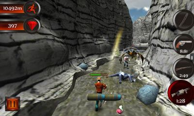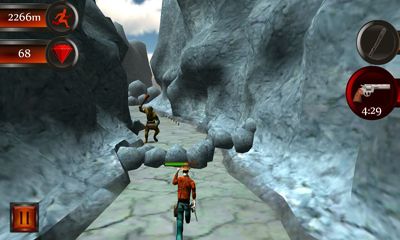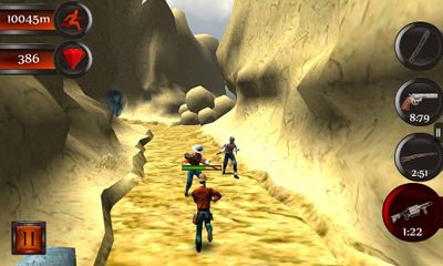Escape. After a long search the Holy Grail was found at last, but a chase after you has begun at once. How far will you be able to run? Werewolves, zombies, bats and orcs are against you, they will do their best to stop you! Control the main hero with gestures and accelerometer, find you way through winding canyons and caves, collect rubies, jump over pits and slide under mounted obstacles. Tap the aim to fire the gun and do not forget to reload! Watch the life bar as attacks of monsters reduce your health level. Buy first-aid kits, cartridges and many other things in an inner-shop. You will have a machete, a gun, a rifle and a grenade launcher at your disposal.