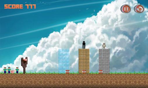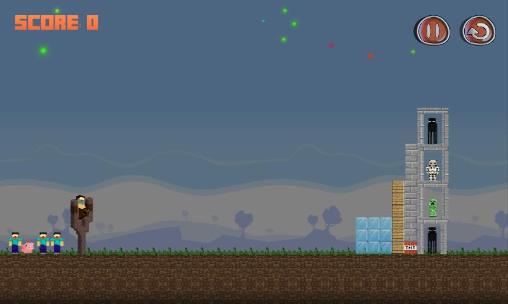 Shoot different characters from the catapult and try to defeat angry monsters destroying their defenses. This Android game combines two popular games: Minecraft and Angry birds. Your task is to destroy different structures made up of blocks. At different levels of the structures you can find all sorts of monsters. Aim carefully and launch characters from a catapult. Calculate the flight path so that your characters hit the structure and destroy the enemy.