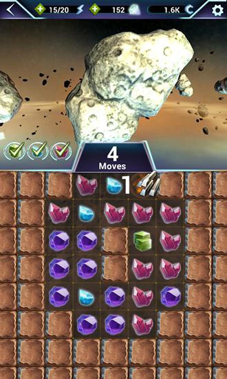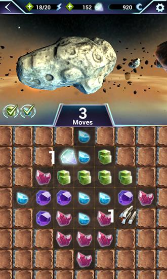 Get valuable resources from asteroids. To complete a mission match 3 and more same resources. Try being a space miner in this game for Android. Go into space and guide your ship from one asteroid to another. Your task is to destroy the asteroid and get valuable resources from it. Match rows of different resources to get them. Get drones and many other improvements to your ship. Explore the asteroids.