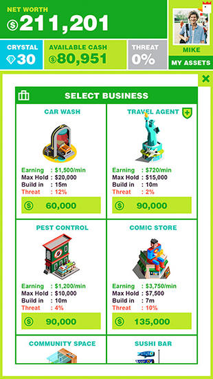 Start your own business and improve it. Tap to get money more quickly. Build various enterprises. Try to become the richest man on the planet in this game for Android. Open a small business and earn money. Take profits spent them on expanding the business. Open casinos, shops, restaurants, factories, etc. But beware, dangerous enterprises may be confiscated by the authorities. Fight for world leadership with other players from around the world.