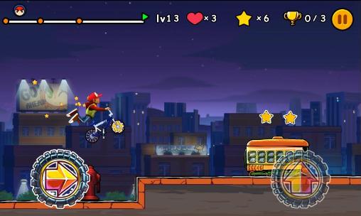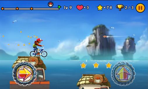 Beat difficult tracks riding your mountain bike. Perform a variety of tricks, collect coins and different bonuses. Help the cyclist win in the extreme competitions of this Android game. Jump over springboards, onto platforms, and fly over pits. Do flips, ride on the rear wheel, and perform other tricks to get more points. Don't let your hero fall, or you'll have to restart the level. Don't forget to collect all the coins, cups and other valuables on your way.