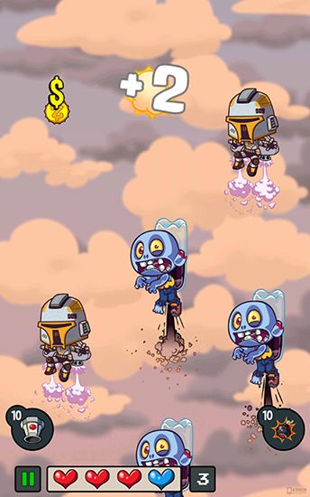Save the galaxy from hordes of bloodthirsty monsters. Now zombies can fly and only you and bounty hunter can stop them. The galaxy is suffering from zombie apocalypse in this Android game. Zombies can fly using jetpacks and they want to capture all the planets. Tap a zombie to destroy it. Drag your finger across a zombie to cut it with a laser sword. But be careful, there's a bounty hunter flying among them. You can't kill him, because he is your ally! Use bombs and other bonuses to defeat zombies.