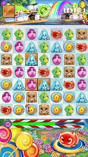 Match 3 and more same pets by swapping them. They'll disappear and you'll get game points. The aim of this Android game is to free as many different pets filling the screen as possible. Plan your moves and match pets so create long rows of same pets. When they disappear you can get more points and useful bonuses that will help you complete levels more quickly and set records.