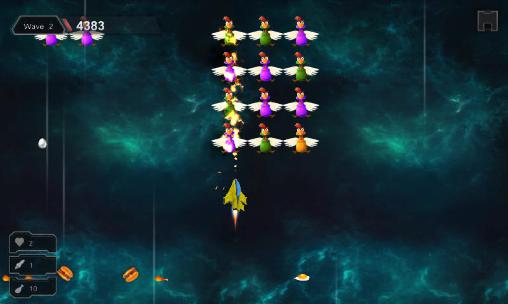 Save our planet from space chicken. Destroy aliens and don't stop shooting your guns. Get ready for endless battles with chicken who come from the outer space. In this game for Android you are the pilot of a space fighter. Move your ship from side to side and do maneuvers to escape from dangerous cosmic eggs. Each hit your ship takes makes you loss life. Collect bonuses, destroy the invaders, and unlock new ships.