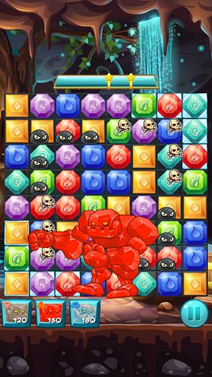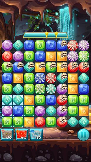Swap colorful jewels and match 3 or more same ones. They will explore and you'll get points. In this Android game you have to blow up a lot of jewels. Unblock the frozen tiles, destroy webs, ancient bones, and stone blocks. Match 4 or more jewels to get an elemental stone with a magical powers that can destroy stone tiles. However magic is powerless against the webs that you can only break by matching 3 same jewels.