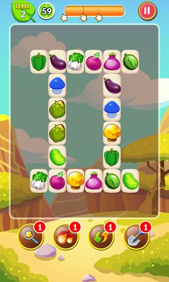 Find pairs of same fruit on the screen. Match those pairs with lines and remove them from the screen. Travel with cute kitten through colorful locations of this game for Android in search of fruits and vegetables. To pass each level, you have to completely clear the playing field of fruits and vegetables. The line you use to connect the food can only bend at 90 degrees two times. Practice, set records, and amaze your friends.