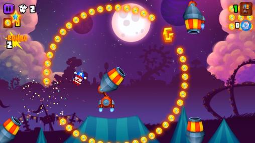 Shoot the hero out of the cannon to collect as much coins and various bonuses as possible. The hero of this Android game travels to different planets of the galaxy. He chose a very unusual way of traveling, he shoots himself out of cannons located at some distance from each other. Point the hero so he flies as far as possible. Use bonuses and boosts. Try to unlock all the funny characters.