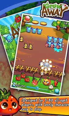 Nd absorbing game named Grow Away for Android OS will give you lots of unforgettable minutes or even hours of joy and good humor. Enjoy classic in its genre and simple game with easy control from its first levels. You will take side of healthy eating and shoot down your enemy, harmful food with a veggie catapult. Take your valorous team of brave vegetables and show the bad food who is a master here. You can choose 9 kinds of different fruits which can be loaded to catapult to blunt attack of the enemy. The game smoothly and slowly instructs you by its brief hints and slow disclosure of its content. You will never get confused in Grow Away and will never ask a question of what you have to do in this or that situation. Four different surroundings in 40 levels will not let you get bored with monotony. The battle will take place both in green valleys and in plague jungles. It is a merry game for the whole family and the lovers of cartoon graphics will like it without doubt.