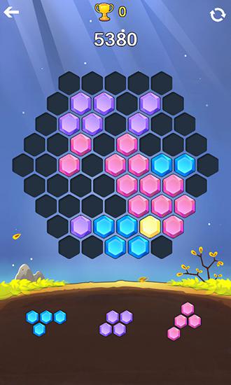 Test your logic and attentiveness in this Android game. The grid has hexagonal shape and is made up of small hexagonal tiles. Under the grid you'll see figures made up of gems. Your task is to place those figures on the screen. Rows of gems that fill the whole rows will disappear.