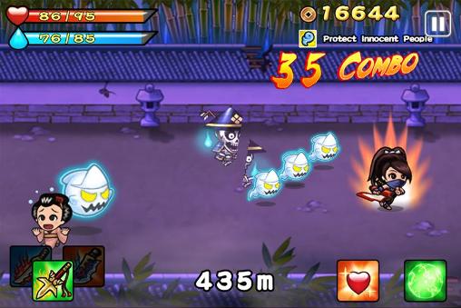 Help a brave ninja girl return ancient scrolls stolen by evil forces. Guide the heroine through various locations and help hes escape the chase. Protect the world from the forces of evil in this Android game. Rush forwards, escape the demons, evil ninjas, huge spiders, and a variety of other enemies chasing the heroine. Run along tiled rooftops of the city, dark forests, deep underground, etc. Collect mystical jade to get extra power. Use magic scrolls that will help ninja destroy enemies and bosses.