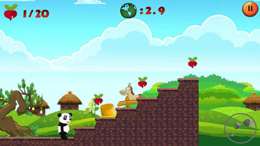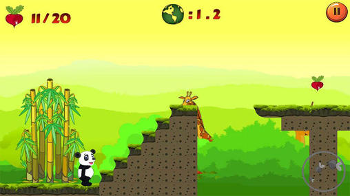 Guide the cute panda through dangerous jungles. Jump over different obstacles, avoid evil bears and predatory plants. Help the main character of this game for Android overcome all obstacles on the way to the level exit. Just tap the screen to make the hero jump. Jump along platforms and hills. Run away from hungry bears or jump on top of them to stun them. Collect red radish. Throw radish into your enemies. Be careful and don't get caught by a terrible plant.