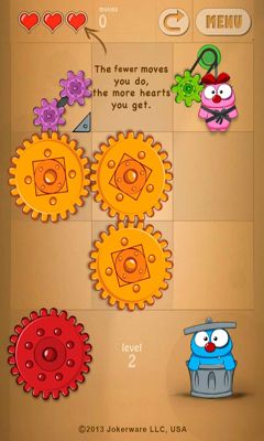 Gears. In the puzzle you will unite the loving hearts of two monsters! The game is quite difficult, but funny at the same time. You will have to solve uneasy tasks during 54 levels! The game has colourful graphics and includes funny characters. To achieve a result you are to combine all of gears in a single rotating mechanism and make the least number of moves for that.