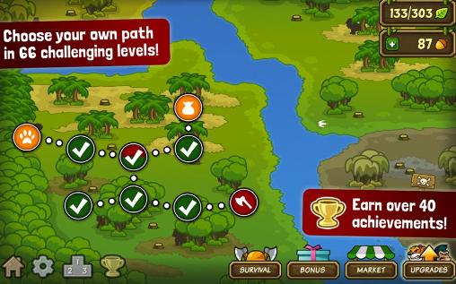 Help a monkey called Coco defend the native forest from a crowd of greedy lumberjacks who want to cut down all of the trees. Together with Coco lead an army of various animals in this game for Android. Fight back the insolent people who what to take away your forest. You'll have gorillas, tigers, kangaroos, beavers, pandas, and other animals on your side. Control a hero jumping on trees. Throw nuts and other stuff at the woodcutters. Collect bananas and acorns to hire new animals into your army. Save the green forest from destruction!