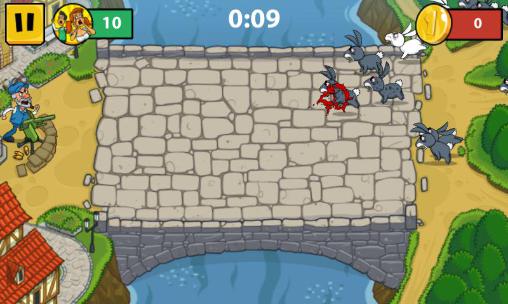 Defend the village from a horde of mad bunnies who want to kill all the villagers. Shoot the horrific bunnies from a gun. The goal of this game for Android is to defend the village for as long as possible. Rabbits are running over the bridge. Point the gun at the most dangerous rabbit and open fire. If rabbits get to the village, they'll start killing people and the game is over. Upgrade your old gun, increasing its firepower. Increase the population of the village. Destroy monsters.
