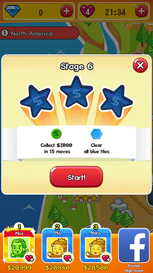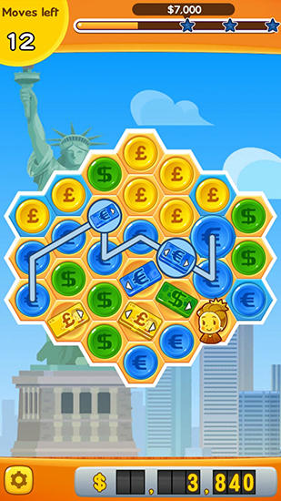 Match colorful coins in a hexagonal tiles on the screen. Match same coins into chains of 3 and more. Become a millionaire by making combinations of the coins in this game for Android. To make millions you need to remove same coins from the screen. To do that try to connect as many same coins with one line as possible. Think over your actions to get useful bonuses. Compete with your friends and set records to become the richest player in the world.
