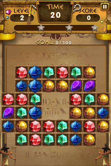 Swap sparkling diamonds and other jewels to match 3 and more same jewels. Try to find the untold treasures of the ancient pharaohs in this game for Android. Match different colorful jewels into rows. Try to complete levels using as little mover as you can or within a time limit. To do this you need to match as many same jewels as possible. That way you get magic stones and other bonuses that will help you accomplish the task.