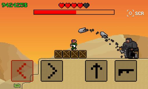 Guide a well-armed hero through many levels full a variety of enemies. Destroy everyone who stands in your way. In this game for Android you need to don't stop shooting, leaving chaos and destruction behind you. Lead your character through challenging levels, jump from platform to platform, overcome a variety of obstacles. Shoot the enemies and avoid enemy fire. Collect various bonuses and boosts. Buy and improve powerful weapons like machine guns, rocket launchers, flamethrowers, etc.