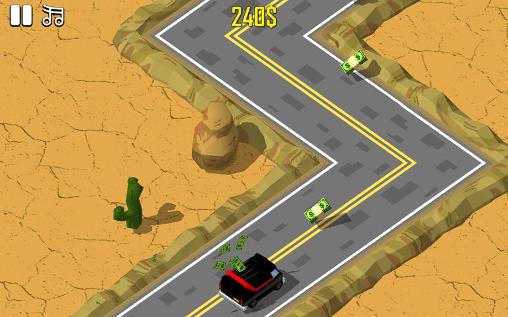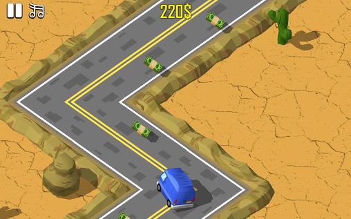Control a fast car speeding along a winding track with many sharp turns. Collect bonuses. Train your reaction speed and observation skills moving along slopes of this dynamic games for Android. Try to guide your car as far as possible along the track. Be careful and touch the screen in time to turning the car into the right direction. Don't crush your car into fences. Collect stacks of money scattered along the highway. Buy new cars with unique looks.
