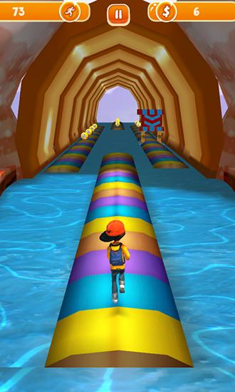 Control one of many characters running along interesting tracks. Collect golden coins and different bonuses, jump over obstacles. Run forward at full speed in this Android game. Keep your hero on the track which is a path in water. Jump from one platform to another and don't fall into water. Jump over various obstacles or slide under them. Pick up useful bonuses like speed ups. Set records and compete with friends.