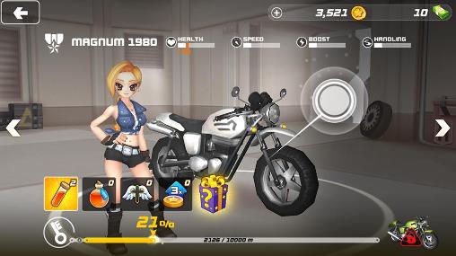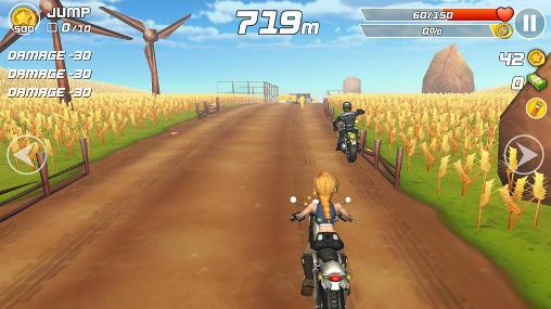 Take part in extreme motorcycle races. Speed along difficult tracks in different corners of the planet. Drive your bike at the top speed through jungle, city streets, railroad, and other picturesque locations of this game for Android. Move from side to side to dodge cars and other obstacles on the road. Fly into the skies using ramps to do jumps and other tricks. Collect gold coins and purchase new bikes and racing suits.