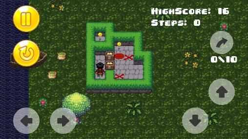 Help a cunning pirate hide the stolen treasure. Move the chests full of gold in the maze and hide them. Use your logic to complete interesting levels of this Android game. Remember that you can move only one chest at a time. The pirate also can't pull the chest behind him, he can only push it forward. Don't forget to collect all the gold coins to get maximum points. Move the chests along the shortest route to the places marked with red crosses.