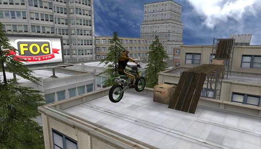 Guide the motorcyclist through extreme city tracks. Jump over various obstacles, go up and down covered stairs. Perform dizzying motorcycle stunts in this Android game. Ride through the city ignoring the rules and restrictions. Go on city rooftops and jump over ramps. Crush barrels, crates, and other obstacles in your way. Be careful surmounting various water obstacles. Try to stay on roofs of moving trains, trucks and other vehicles.