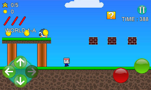 Guide a cute character with a square head through a lot of absorbing levels full of dangers. Overcome all the obstacles and collect all the coins in this Android game. Go through different worlds, from green hills to dark dungeons. Jump on platforms and over deep pits. Use jetpack to jump higher. Pick up bonuses and look for hidden treasure. Avoid the enemies, run away from them or jump on top of them to defeat them.