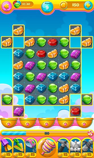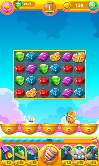 Swap different sweets, match them in rows of 3 and more. Explode them and get points. Travel the magical kingdom of candy in this Android game. Get a certain number of points to complete a level. Try to match the largest possible number of same sweets, get various bonuses and power-ups that will help you blow up even more goodies and complete the levels quicker. The shape of the playing field changes with each new level and your task becomes more difficult.
