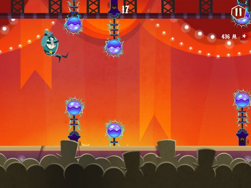 Control a funny circus acrobat who's flying near the big top swinging on ropes. Collect bonuses and avoid dangers. The aim of this Android game is to help the brave acrobat to be in the air for as long as possible. Touch the screen with your finger to change where your rope is attached to. Moving the hero forward and try to make the hero jump through the hoops made up of balloons. It will bring you extra points. Be careful and don't let the hero touch electrodes.