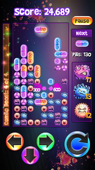 Move colorful pills with medicine on the screen to destroy dangerous viruses and microorganisms. Use your logic and wit to fight epidemics of dangerous diseases in this game for Android. The playing field is filled with colorful viruses. You have to clear the playing field. To do that place the falling pills to make them form rows of same color with viruses. The groups of the same colors will disappear.
