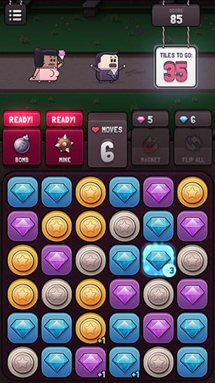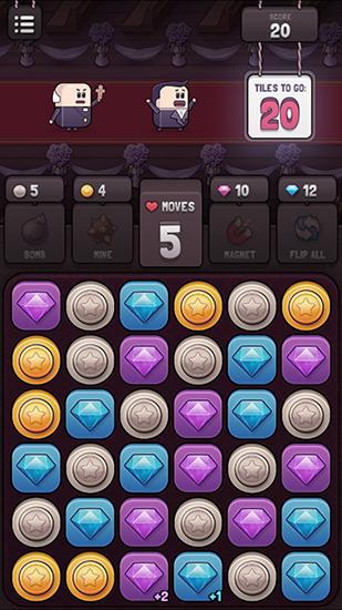 Match 3 and more same tiles to make them disappear. Do tasks in a certain number of moves. Train your logic and memory in this fun game for Android. Help the groom escape from the church. To do that you'll need to destroy groups of same tiles. There are total of 4 types of tiles. Touch a tile to turn it upside down. On the reverse side you'll see a different type of tile. Use this feature to match rows of same tiles.