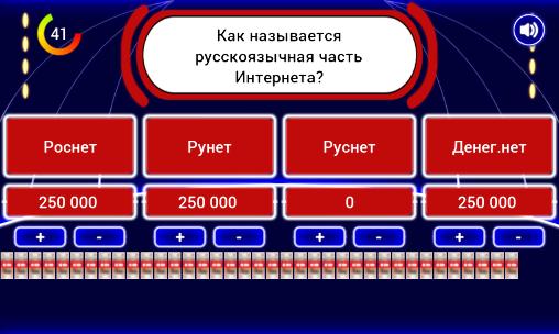 Take part in an absorbing trivia. Answer questions from different branches of knowledge. Don't make mistakes. Show your wit and logic in this addictive game for Android. Initially the player has 10 million rubles. The aim of the game is to keep this amount until the end. You'll have to bet on every quiz question. If your guess is incorrect you loose the money. Try to correctly answer as many questions as possible to have as much money as possible.