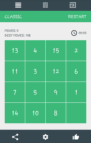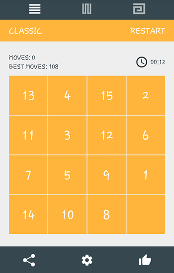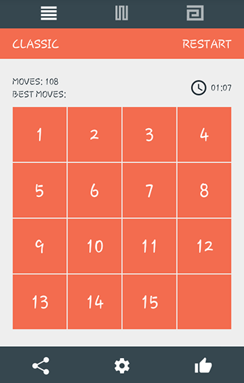 Move squares with numbers from 1 to 15 of the screen. Swap them and place them from the lowest to the highest. Train your logic and intelligence in this simple but addictive puzzle game for Android. The grid consists of 16 squares. 15 of them have numbers in them, and 1 square is empty. You can swap nearby squares. The aim of the game is to place all the numbers from 1 to 15. To score maximum points try to make as little moves as possible.