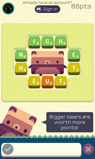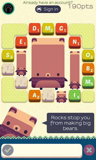 Help a funny bear make up words out of letters on the screen. Tap tiles with letters in the right order. Show your powers of observation and English knowledge making words in this game for Android. Try to create as long words as possible to get more points. After getting a certain number of points you can go to the next level. In addition you'll be able to unlock new bears and other funny characters who will help you complete tasks.
