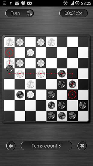 Move checkers on the 8 by 8 tiles board. Try to be faster your opponent and move all your pieces to the opposite corner. The aim of this Android game is to move all your checkers into enemy's house. Initially players have 12 checkers in opposite corners of the board. You move in turns. You can move your checker one tile in any direction. Additionally you can jump over another checker if there's an empty tile behind it. You can jump unlimited times in one move.