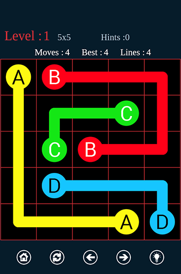 Connect the pairs of same dots with continuous lines. Those lines can't intersect one another. Train your logic in this Android puzzle game. The square board is divided into cells. The size of the playing field can vary from 5x5 to 10x10. The playing field has colored dots on it and there's always 2 dots of one color. Connect the same dots with lines of the same color. Lines can go only at right angles and can't overlap one another.