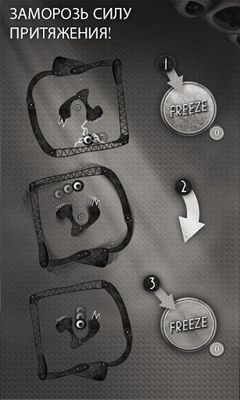 Ze!. A nameless hero was glad to meet another day, when the sharp hooks pulled him out of his habitual environment. He was sent to a distant planet and incarcerated in a small cell. He was depressed and desperate as could do nothing at all! But he still had a glimmer of hope that you would come to help him. Help your hero to get out of incarceration by changing the direction of gravity by turning the cell and pressing a Freeze! button, that switches off gravity in time. Lots of levels in which you will have to twist your brain are waiting for you. The brain-twister is physically based and has a clear game mechanics. It also has an excellent graphics made by Schenk, the designer and illustrator, who has added a lot of gloom to it.