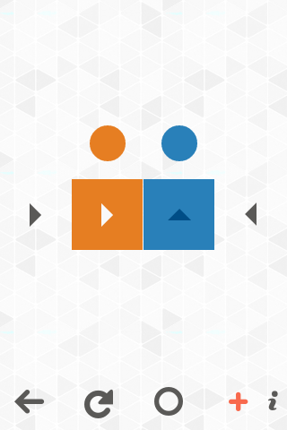 Move colorful squares so they end up on circles of the same color. The squares of this Android game can be moved only in direction indicated by a triangle on it. The screen has arrows pointing into different directions. If you place any square on the arrow the square changes its moves correspondingly. If you move one square you may push any other one in the given direction.