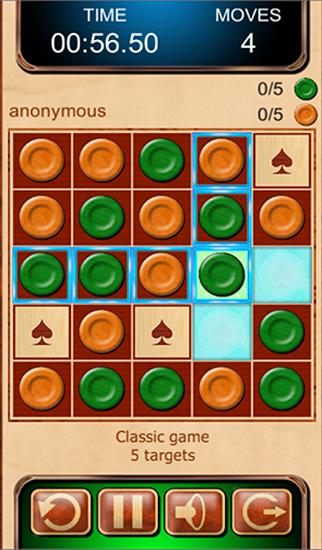 Move round pieces on the screen. Cover all the card symbols that are on some tiles with pieces of the same color. Improve your logic solving interesting logic puzzles in this game for Android. The playing field has pieces of 2 colors. Some tiles are empty, and some have card symbols. Drag pairs of same pieces horizontally or vertically. Swap and dragging pairs to cover all the symbols. To the task using as little moves as possible.