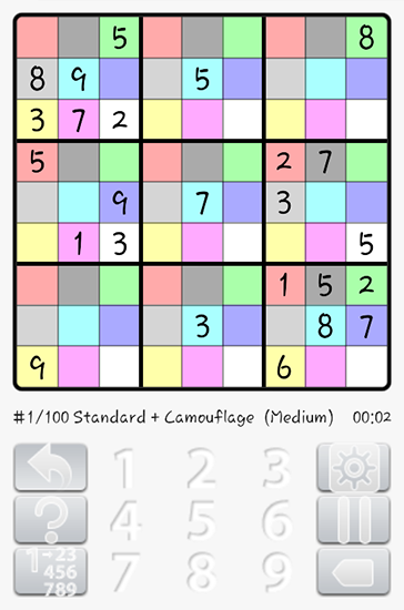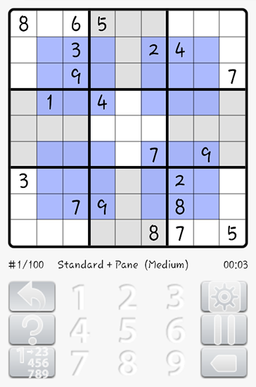 Solve classic Sudoku puzzles. Fill in the tiles of the playing field with numbers from 1 to 9. Train your logic and develop quickness of wit in this Android game. The playing field is 3 by 3 boxes and each box has 9 tiles. Some of the tiles have numbers in them. Your task is to fill in all the tiles with numbers. You need to do this in such a way as not to repeat a single number in any given row, column, or box.