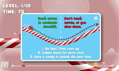 Llent children's arcade game in which you are to drive an incredibly nice car along sweet caramel tracks! The rules of the game are quite simple, you have to press the screen during the descent of the mountain and the car will gain speed; but do not touch the screen during the rise for the car not to stop! Incredible tracks you have to show breathtaking stunts and jumps on are realized in vivid and colourful graphics!