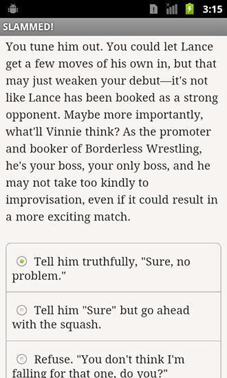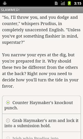 Help the hero build a career in professional wrestling. Participate in fights, find friends, and defeat enemies. This Android game book will take you to a tough but exciting world of professional wrestling. Together with a young athlete you'll go a long way to becoming a wrestling world star. Choose among several options at key moments of the story. Think twice before you make your choice, because it determines the further development of the story.