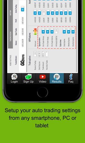 Setup your auto trading binary options settings. Setup your account, fix limits and get income. Thanks to the revolutionary software you don't have to worry about updates anymore and you can get results even without net connection.