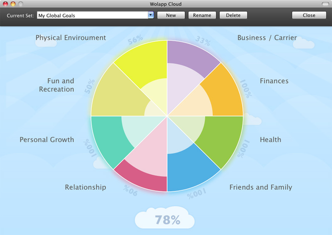 Free desktop client for the web-based Wolapp Cloud application, specially developed for Mac OS X. Wolapp Cloud - Wheel Of Life Cloud is a web-based application for self-development and personal growth. Wolapp Cloud Client allows using the application without a web browser. The client fully replicates all the major functions of the original application: assessing areas of your life (Business, Finances, Health, Relationships, Personal Growth, etc.), renaming the areas, setting goals, working with multiple goal sets, easily printing any goal sets, and a lot more. On top of that, the client displays the goal completion progress, as percentage, for each of the areas and the total progress for all of your goals in a set. Install the client, register with Wolapp Cloud and start making your life richer, versatile and interesting.