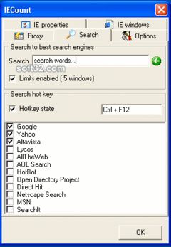 Search with IECount in the best search engines! The quickest way to start search - press hotkey: (ctrl + F12 default), type word or phrase and press Enter - your will get results from the best engines: Google, Yahoo (get the result from the 10 best search engines).
