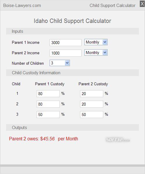 The Boise Lawyers Child Support Calculator is a great tool for estimating child support payments in the state of Idaho, in the case of divorce or other custody proceedings. The calculator is based upon suggestions from the third judicial district court. The court provided guidelines to give specific guidance for evaluating evidence in child support proceedings. The court stated "Acknowledging there are diverse needs and resources in individual cases, the following Guidelines will produce a more equitable and uniform approach in establishing child support obligations." The calculation is based upon income, number of children, and custody. Idaho attorneys will find this tool useful as they sit with clients and can help them estimate their Idaho child support obligations.Here are some quick tips on using the calculator. First enter the income for each spouse. Be aware that the income can be entered in as monthly or annually by using the drop down box menus. Then choose the number of children. In some divorce families the custody is different per child. Enter the percent of time each child spends with the a parent. The time spent with the other parent will be calculated automatically. The parent that owes and their payment will be defined at the bottom of the application.